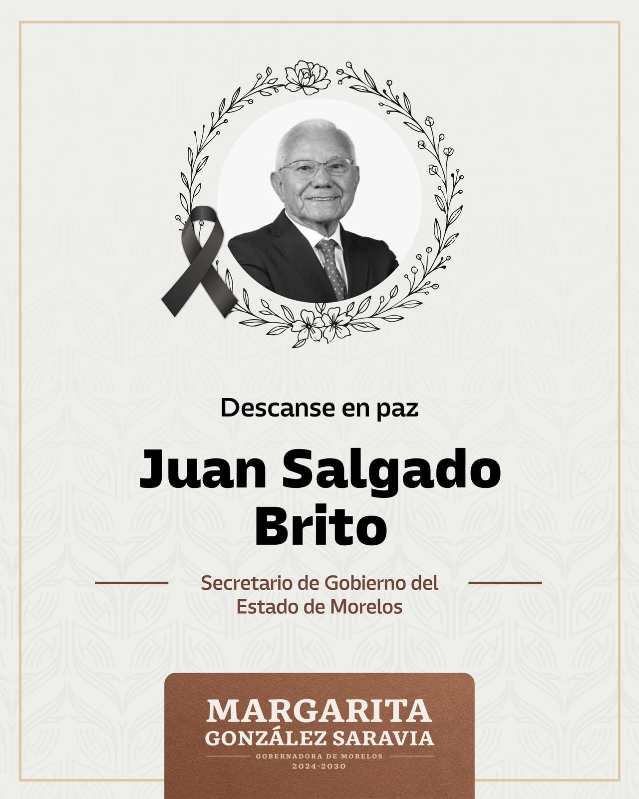 Lamento profundamente el fallecimiento del doctor Juan Salgado Brito, secretario de Gobierno del estado de Morelos. Un hombre de profundas convicciones, comprometido con el desarrollo de Morelos y con las causas sociales, que marcaron su trayectoria.