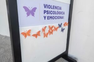 Acompañados por la fiscal especializada, personal de Fiscalía Morelos colocó seis mamparas en donde se señalan los diferentes tipos de violencias para que las mujeres puedan visibilizarlas y expresar las violencias que enfrentan.