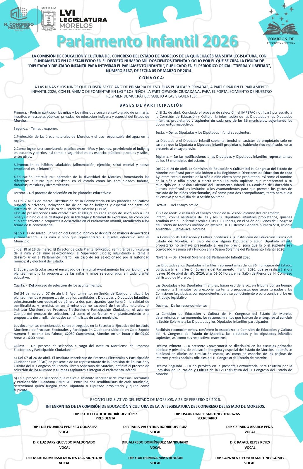 El Parlamento Infantil 2026 es un mecanismo de participación establecido mediante Decreto por el Congreso del Estado de Morelos, cuyo objetivo es garantizar el derecho de las niñas y los niños a expresar libremente sus ideas sobre los asuntos que impactan su entorno.