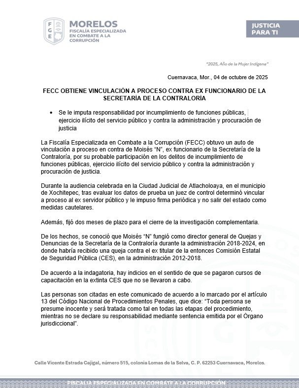La Fiscalía Especializada en Combate a la Corrupción (FECC) obtuvo un auto de vinculación a proceso en contra de Moisés “N”, ex funcionario de la Secretaría de la Contraloría, por su probable participación en los delitos de incumplimiento de funciones públicas, ejercicio ilícito del servicio público y contra la administración y procuración de justicia.