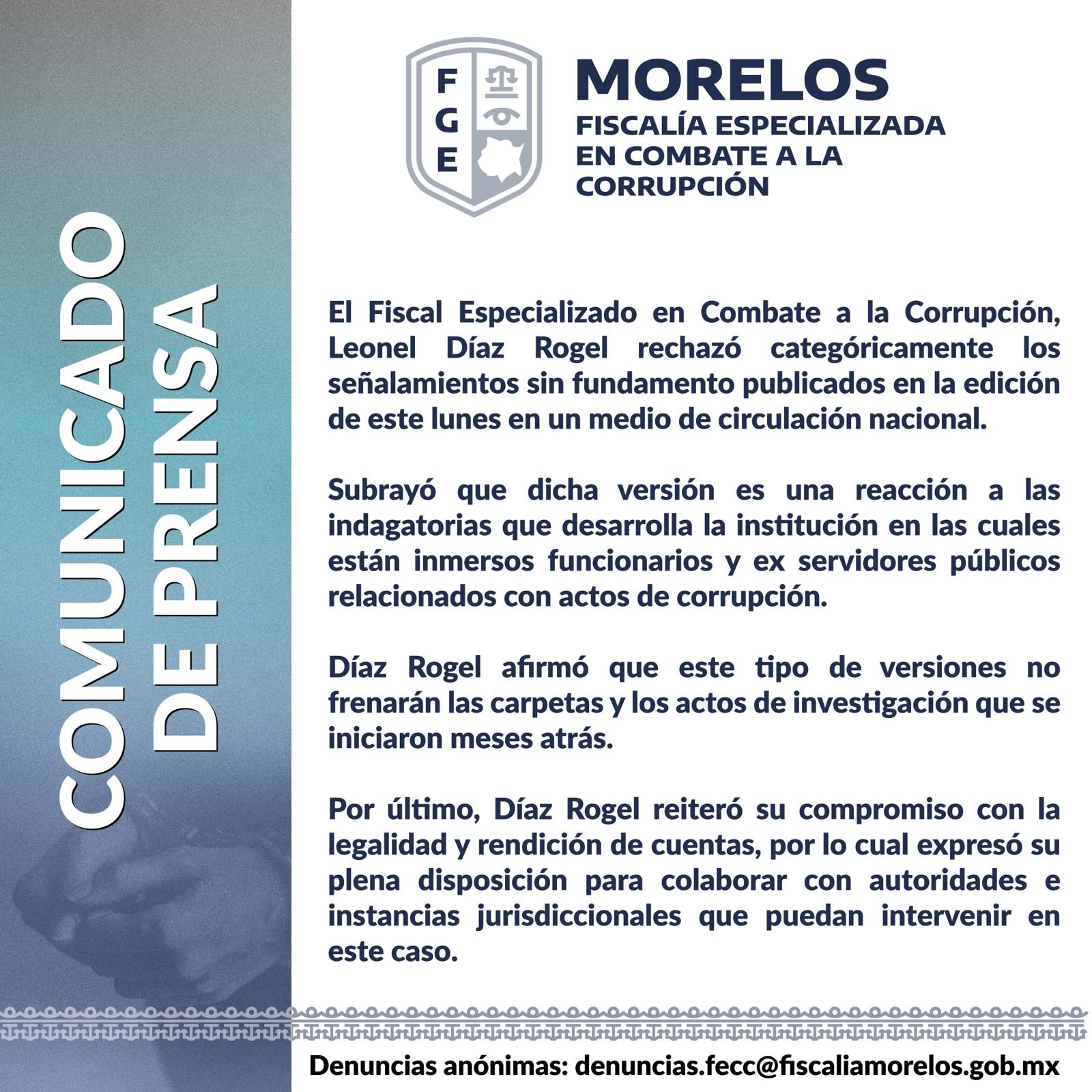 El Fiscal Especializado en Combate a la Corrupción, Leonel Díaz Rogel rechazó categóricamente los señalamientos sin fundamento publicados en la edición de este lunes en un medio de circulación nacional.