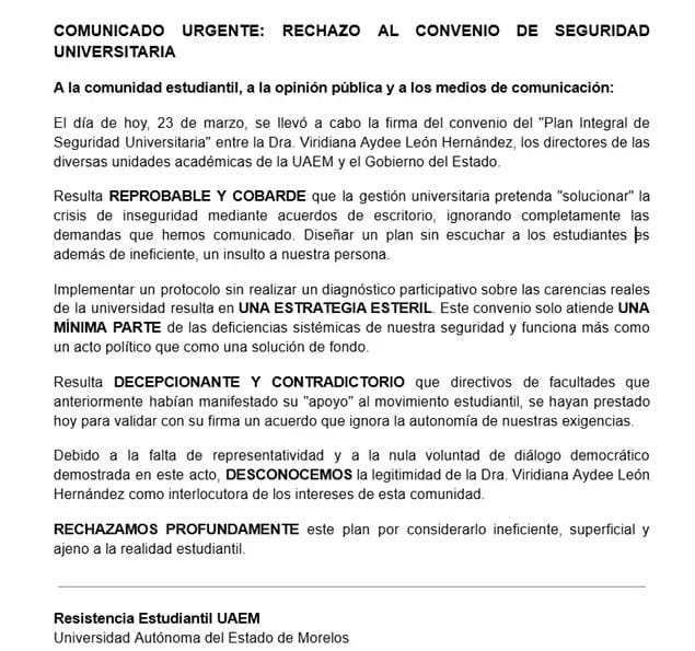 Asimismo, expresaron su inconformidad con el Plan Integral de Seguridad Universitaria, firmado recientemente entre el gobierno del estado y la UAEM. Los estudiantes calificaron dicho acuerdo como ineficiente, superficial y desconectado de la realidad que se vive dentro de la comunidad universitaria.