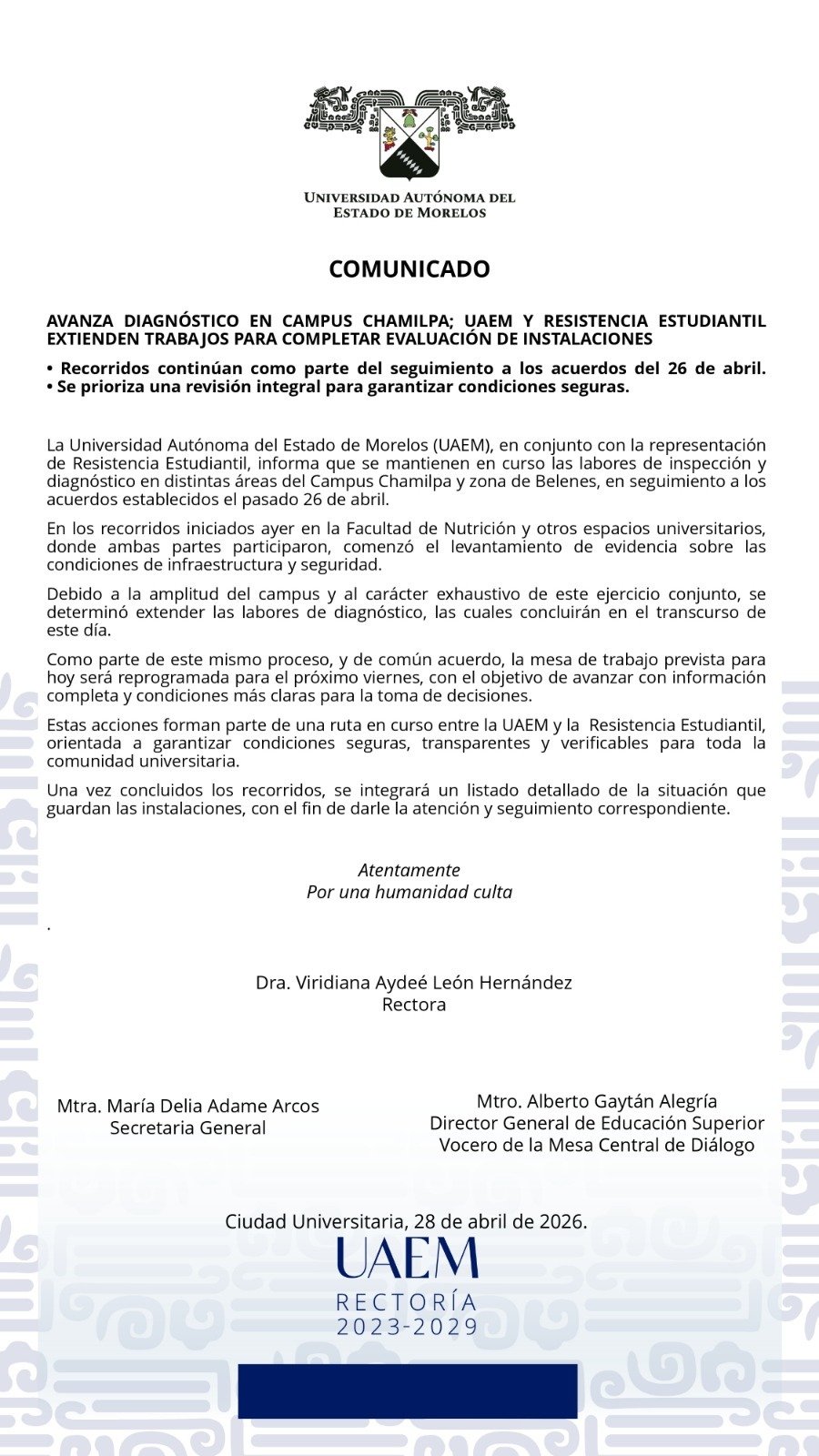 A través de un comunicado, la Universidad Autónoma del Estado de Morelos (UAEM) informó que se avanza en el diagnóstico del campus Chamilpa, en coordinación con integrantes de la Resistencia Estudiantil, así como en la zona de Belenes, con el objetivo de evaluar las condiciones de infraestructura y seguridad.