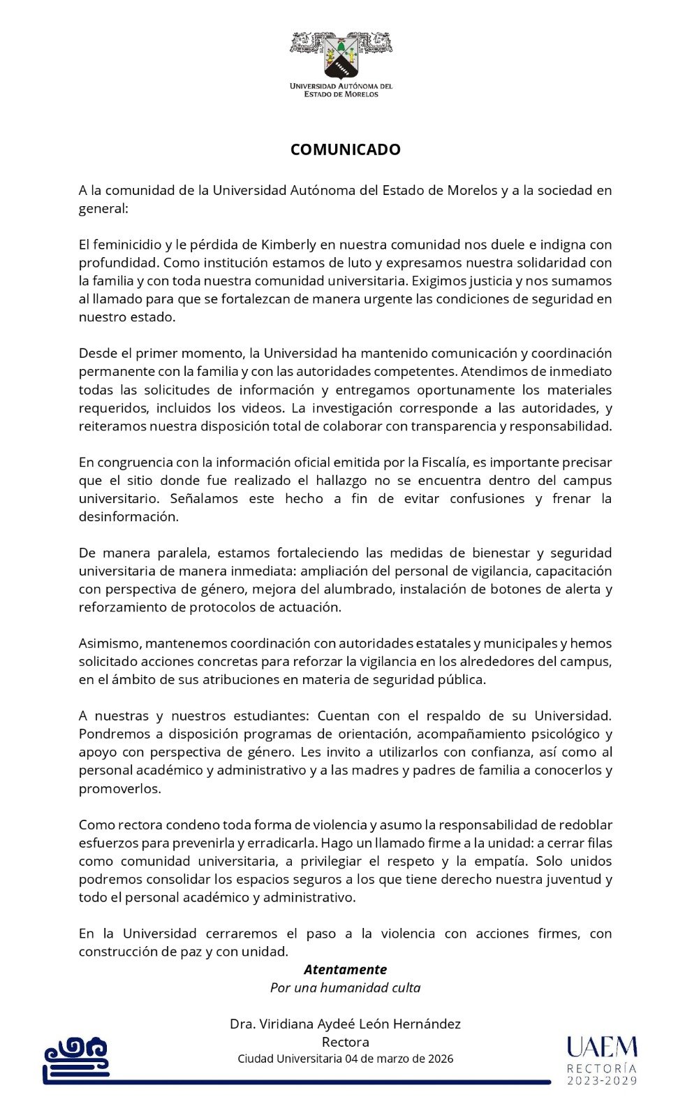 La Universidad Autónoma del Estado de Morelos (UAEM) hizo un llamado a las autoridades correspondientes para fortalecer de manera urgente las condiciones de seguridad en el estado de Morelos, luego del feminicidio de Kimberly, hecho que duele e indigna a toda la comunidad universitaria.