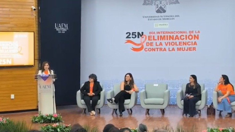 La rectora de la Universidad Autónoma del Estado de Morelos (UAEM), Viridiana Aydeé León Hernández, encabezó la conferencia impartida por Olimpia Coral Melo Cruz como parte de las actividades conmemorativas por el Día Internacional de la Eliminación de la Violencia contra las Mujeres #25N.